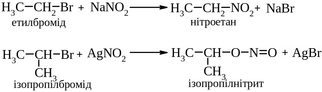 6. Взаємодія з солями нітратної кислоти. Продукти цих реакцій залежать від умов проведення реакцій, будови галогеналкану та солі.