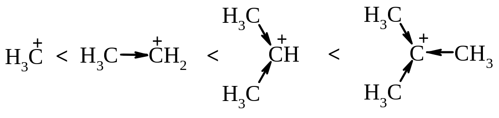 2. Оскільки в реакціях SN1 на лімітуючий стадії утворюється карбокатіон, швидкість реакції перед усім залежить від відносної стійкості карбокатіону, тобто від електронних факторів: чим стійкіший утворений карбокатіон, тим більша швидкість реакції. Стійкість алкільних карбокатіонів обумовлена делокалізацією позитивного заряду за рахунок +І-ефекту і збільшується в ряду: