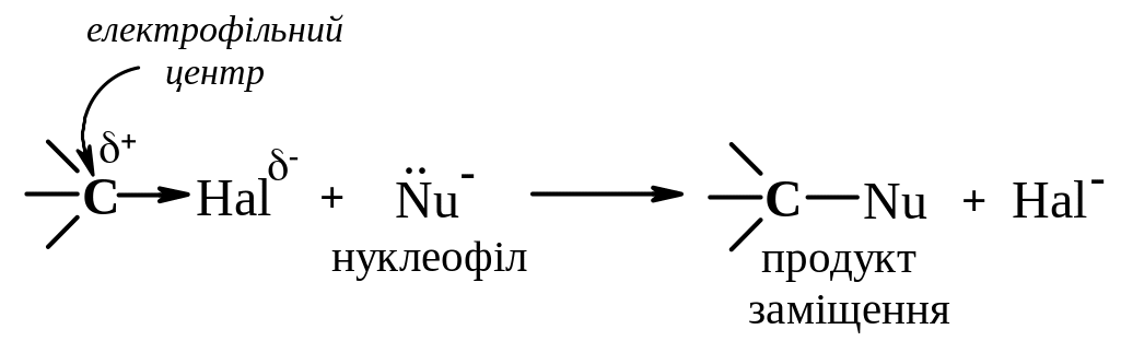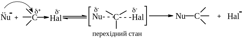 При нуклеофільному заміщенні нуклеофіл атакує молекулу, віддаючи для утворення нового зв’язку свою пару електронів, а атом галогену відщеплюється від молекули галогеналкану з електронною парою зв'язку С–Наl.
