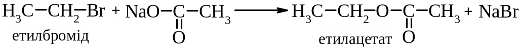 3. Взаємодія з солями карбонових кислот. При дії солей карбонових кислот на галогеналкани утворюються естери. Реакція проходить у середовищі апротонного полярного розчинника (диметилформамід, диметилсульфоксид).