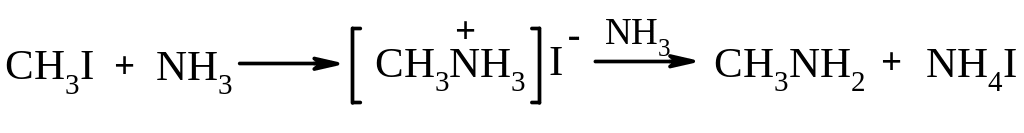 4. Взаємодія з амоніаком, алкіл- та арил амінами. При взаємодії з аммоніаком та амінами галоген алкани алкілують їх з утворенням суміші первинних, вторинних і третинних амінів, а також – четвертинних амонієвих основ.