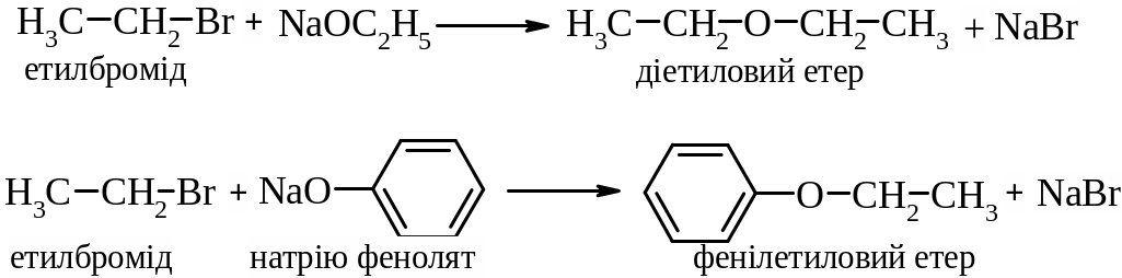 2. Реакція Вільямсона. Реакція взаємодії галогеналканів з алкоголятами та фенолятами є одним з найкращих методів одержання етерів.