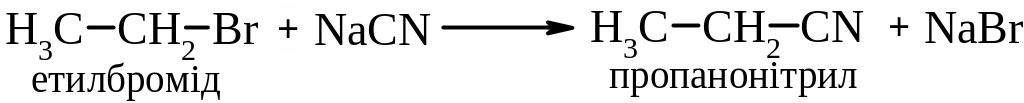 5. Взаємодія з солями синільна кислоти. Первинні та вторинні галогеналкани з натрієм або калієм цианідом у середовищі апротонного полярного розчинника утворюють нітрили (SN2).