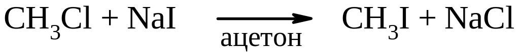 4. Реакції обміну атомів галогену, які базуються на різній розчинності солей у певних розчинниках, наприклад: