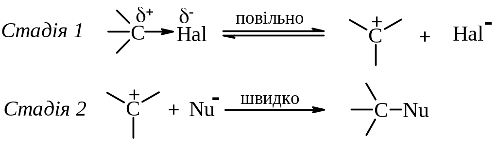 Механізм SN1 (заміщення нуклеофільне першого порядку або мономолекулярне нуклеофільне заміщення).