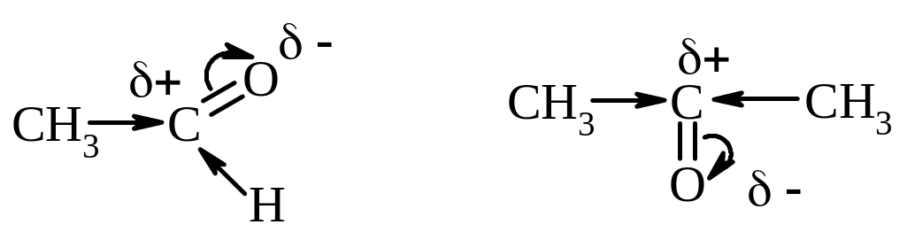 У випадку альдегідів таке зниження δ+ проходить менше, так як тільки одна алкільна група. Для кетону таке зниження δ+ на карбонільному атомі Карбону проходить більше, так як в цьому випадку має місце вплив двох алкільних груп.