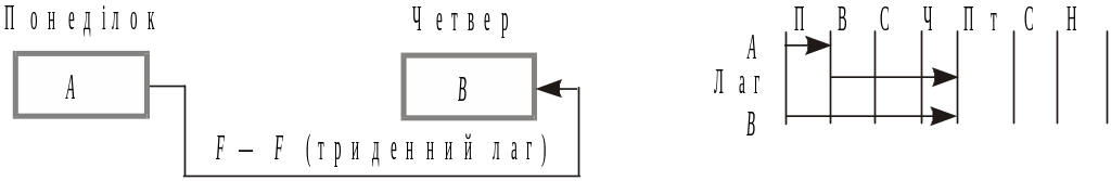 На цій схемі відображено зв’язок між початком А і кінцем В (щоб визначити сумарний термін виконання двох робіт). Наприклад, якщо автомобіль взяли напрокат на шість днів, то роботи з доставки у певний пункт і повернення мають бути закінчені у ці строки. Така залежність трапляється рідко.