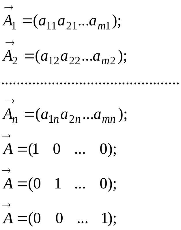 Для зручності подальших міркувань запишемо коефіцієнти системи при однакових невідомих (по стовпцях) у вигляді наступних векторів:
