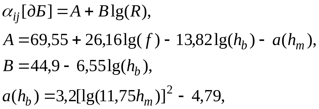 Для розрахунку коефіцієнтів загасання на трасах РСБН-МС в межах міської зони можна скористатися емпіричною формулою Окомури, що міститься в рекомендації Р.370 ITU-R: