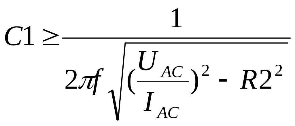 где IАС – действующее значение тока в цепи, А; UАС– действующее значение напряжения в цепи, В; f – частота переменного напряжения, Гц; R2 – сопротивление резистора R2, Ом. Значение С следует округлить в большую сторону и по справочнику выбрать тип напряжение и номинал конденсатора из ряда стандартных значений.