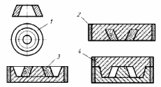 Рис. 2. Схема этапов формовки с подрезкой: 1 – отливка; 2 – набивка нижней опоки; 3 – подрезка вокруг модели; 4 – собранная форма