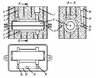 Рис. 1. Устройство литейной формы: 1 – полость; 2 – формовочная смесь; 3 – опока нижняя; 4 – опока верхняя; 5 – выпор; 6 – отверстия для выхода газов; 7 – прибыль; 8 – стержень; 9 – разъем формы; 10 – воронка; 11 – стояк; 12 – шлакоуловитель; 13 – зумпф; 14, 15 – питатели