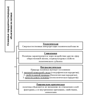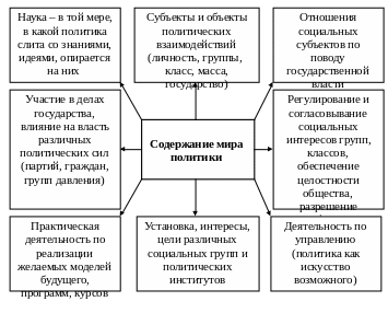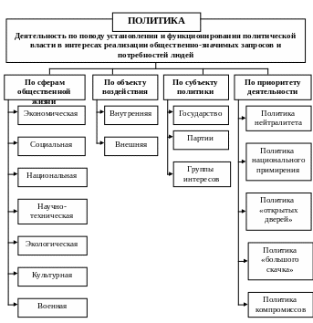 Термин «политика», как цивилизованная форма общности, введен Аристотелем. Политика – 1) особая сфера деятельности, связанная с властными отношениями, с государственным устройством, с институтами, принципы и нормы которых должны обеспечивать нормальную жизнь людей; 2) область взаимоотношений между социальными общностями по осуществлению совместных интересов с помощью разнообразных средств, основными из которых является политическая власть; 3) это целенаправленное участие социальных групп, личностей в делах государства.