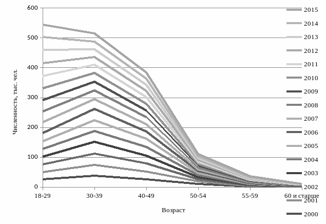 Трудовая миграция в Россию формируется сразу после распада Советского Союза. Сначала она не была четко выражена и переплеталась с другими видами миграции. Но в начале 2000-х годов трудовая миграция начинает активно расти. В 2000 г. официально работало всего лишь 213 тыс. иностранных граждан, в 2014 г. – 1043,8 тыс. чел. Данные Росстата за 2015 год дают только число прибывших и убывших. Но по данным ФМС России официально работающих мигрантов около 1,5 млн. чел. Данные о нелегальной миграции сильно различаются и носят оценочный характер.
