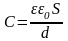 Плоский конденсатор состоит из двух параллельных металлических пластин площадью S каждая, расположенных на расстоянии d друг от друга. Емкость плоского конденсатора выражается формулой: