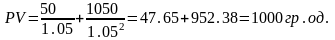 Оцінимо вартість облігації номіналом 1000 гр од з річною ставкою купона – 5%, строк обліку облігації – 2 роки, якщо: