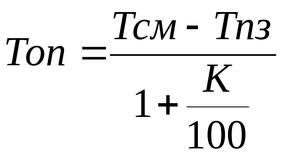 Например, пусть норматив подготовительно – заключительного времени – 15 мин на смену, норматив времени на отдых и личные надобности – 3 % от оперативного времени, норматив времени на обслуживание рабочего времени – 5 % от оперативного времени. Определим нормативное оперативное время: