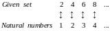 EXAMPLE. The even natural numbers 2, 4, 6, 8, . . . is a countable set because of the 1-1 correspondence shown.