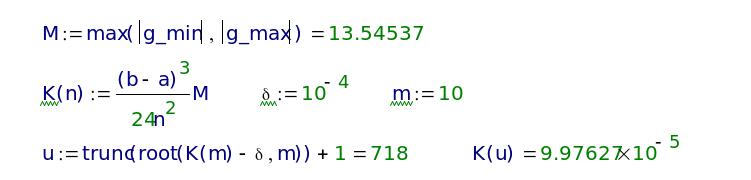 Как видно из Листинга 1.6 полученное число узлов u удовлетворяет заданной точности с большим «запасом». Это происходит потому, что оценка абсолютной погрешности K(u) – оценка сверху. Она показывает максимальное возможное отклонение квадратурной суммы от точного значения интеграла. На самом же деле погрешность может быть значительно меньше, как в приведённом примере.