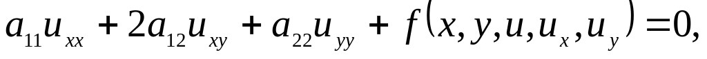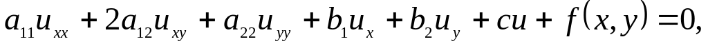 В самом общем случае ДУ1 в частных производных 2-го порядка с двумя независимыми переменными записывается в виде: