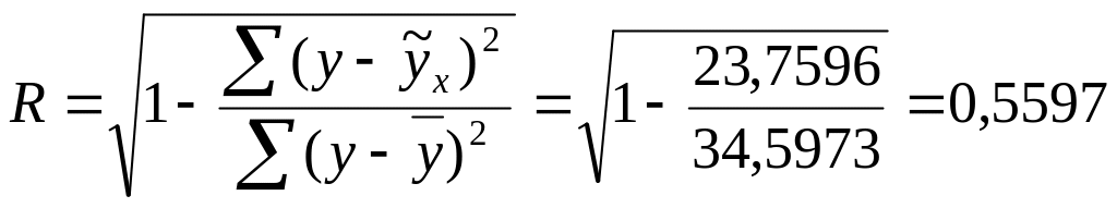 Квадрат индекса корреляции – индекс детерминации характеризует долю вариации результативного признака обусловленную влиянием включенного в модель фактора .