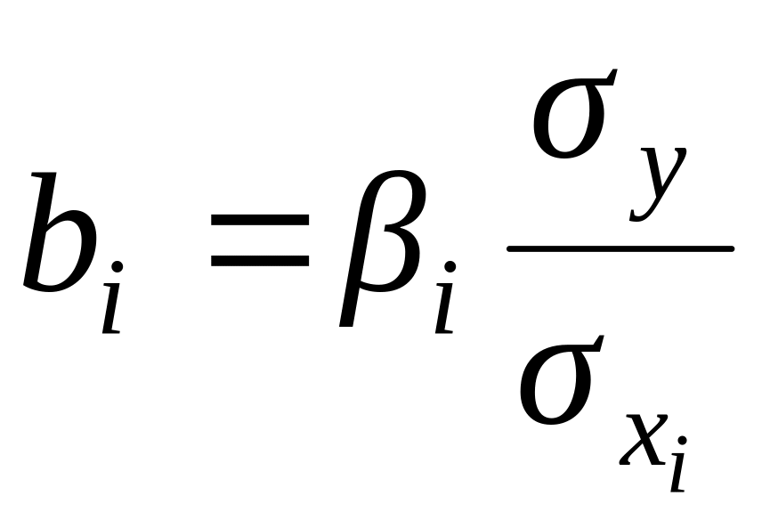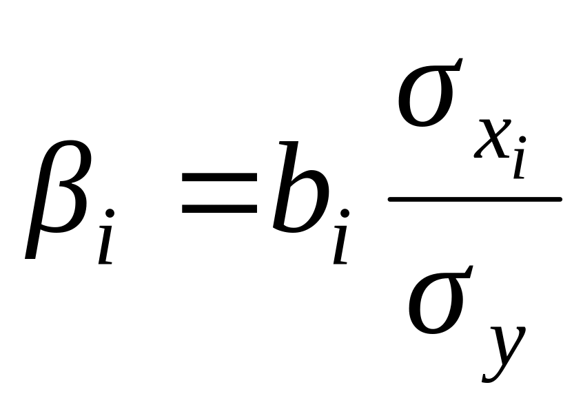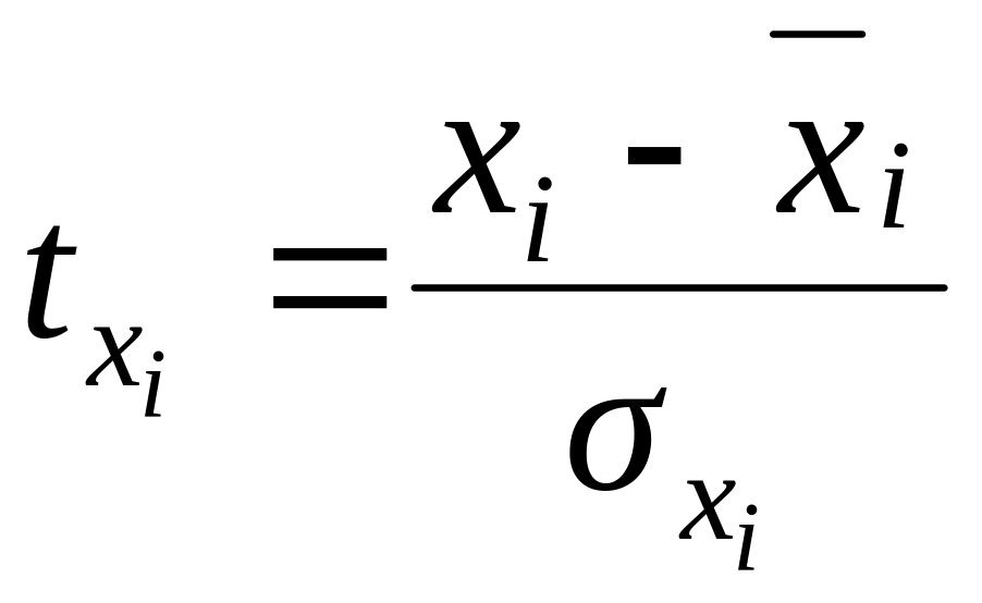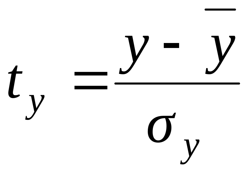 Коэффициенты регрессии можно рассчитать и используя уравнения регрессии в стандартизованном виде представив все переменные уравнения как центрированные и нормированные. Для этого выразим их как отношение их отклонений от средних величин на их стандартное отклонение: