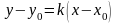 Пусть прямая проходит через точку М (х0; у0) и ее направление характеризуется угловым коэффициентом k. Уравнение этой прямой можно записать в виде , где b — пока неизвестная величина. Так как прямая проходит через точку М (х0; у0 ), то координаты точки удовлетворяют уравнению прямой: у0 = kх0 + b . Отсюда b = у0 — kх0 Подставляя значение b в уравнение у = kх + b , получим искомое уравнение прямой y = kx + y0 – kx0 , т. е.
