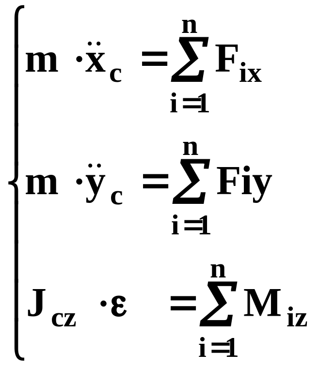 Как известно из кинематики (КИНЕМАТИКА стр. 11), плоскопараллельное движение можно представлять как выполнение телом одновременно и поступательного и вращательного движения. Поэтому уравнения движения для этого случая должны включать уравнения аналогичные и (43), и (56). Проще всего уравнения получаются, если в качестве полюса выбирать центр масс тела. Кроме того, выберем систему координат таким образом, что оси X и Y лежали в плоскости движения, а ось Z перпендикулярна ей. Тогда уравнения движения могут быть выражены в проекциях в следующем виде