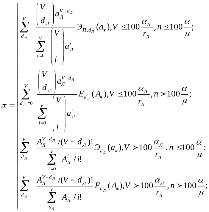 В первой модели занятость линии определяется двумя потоками: собственно вызов (с интенсивностью λ, интенсивностью обслуживания μ, интенсивностью нагрузки A=λ/μ) и потоком моментов выхода из строя линий, образуемым конечным числом источников нагрузки – числом исправных линий. В состоянии с k исправными линиями интенсивность выхода одной из них из строя равна kω, интенсивность ее обслуживания θ, интенсивность нагрузки AL=ω/θ. Если предложить, что линии выходят из строя намного реже, чем поступают вызовы, имеем два независимых процесса: процесс обслуживания вызовов, который описывается формулой Эрланга с переменным числом исправных линий, и процесс выхода из строя и восстановления линий, где число исправных линий описывается распределением Энгсета. Следовательно, вероятность потери вызова на V-линейном пучке.