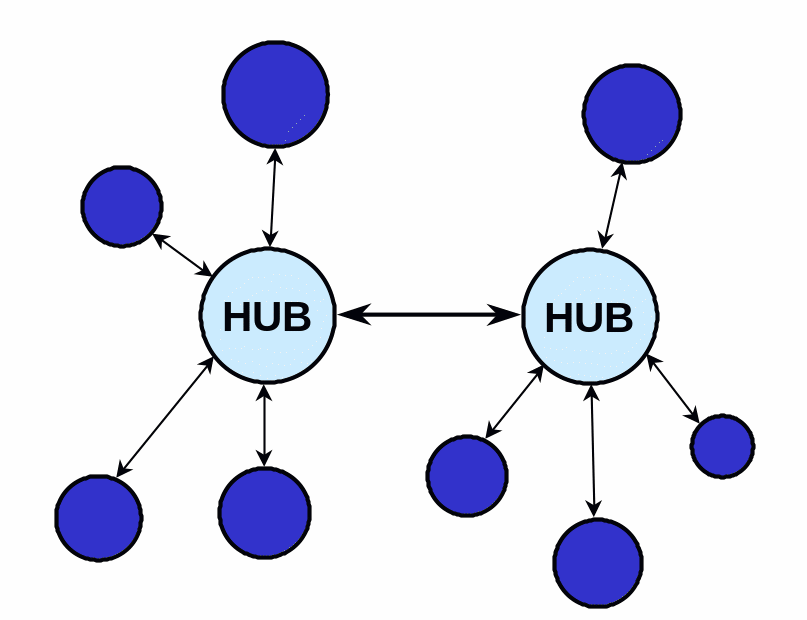 Система Hub and Spoke: это особый и достаточно популярный тип сети. Состоит из центрального узла сети, так называемого «Сортировочного центра» (Hub), и нескольких небольших узлов системы. Сортировочный центр связан со всеми узлами системы посредствам “узлов” (spoke).