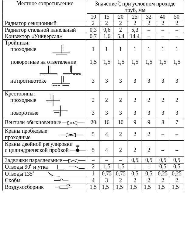 Потери давления на трение на участке определяют умножением величины потерь давления на 1 п.м. «R» на длину трубопровода на участке «l». А потери давления в местных сопротивлениях умножением динамического давления «Рд» на сумму коэффициентов местных сопротивлений на участке «Ʃξ». Значения некоторых коэффициентов местных сопротивлений приведены в таблицах 7.4 – 7.6.