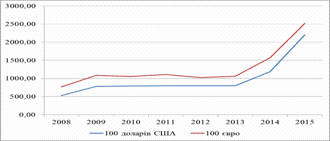 Рис. 2.1. Динֺамֺіка офіційного курсу гривнֺі до долара США та до євро (середніֺй за перֺіод) у сֺічнֺі 2008 – 2015 років, грн. за 100 дол.США
