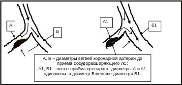 На рисунке – правая ветвь не поражена атеросклерозом и сохраняет способность сужаться или расширяться. Другая же ветвь имеет выраженный атеросклероз и поэтому постоянно максимально расширена. Назначение в этой ситуации пациенту какого-либо ЛС, расширяющего коронарные сосуды, может вызвать ухудшение питания той области миокарда, которая кровоснабжается поражённой атеросклерозом коронарной артерией.