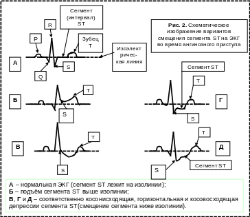 Ишемическая болезнь сердца (ИБС) – это острое или хроническое несоответствие между потребностью миокарда в кислороде и уровнем его доставки по коронарным сосудам. Стенокардия (angina pectoris) – наиболее частый вариант ИБС, характеризующийся приступами ангинозной боли длительностью от нескольких секунд до 15 мин, купирующимися (снимающимися) сублигвальным приёмом нитроглицерина. Во время приступа на ЭКГ могут наблюдаться смещения сегмента ST относительно изоэлектрической линии и изменение формы зубца Т (см. рис. 2). Острый инфаркт миокарда (ОИМ) – крайняя степень проявления ИБС характеризующаяся образованием в сердце одного или нескольких очагов некроза из-за острого нарушения коронарного кровообращения.
