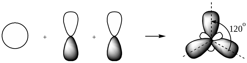 Оси sp2-гибридных орбиталей находятся под углом 180, то есть лежат на одной прямой. Это ещё менее вытянутые орбитали, чем sp2-гибридные.