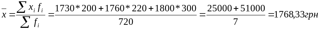 x*=ΣМ/Σ(М/х)= (360,65+456,00+347,80)/((360,65/1765)+(456/1780)+(347,80/1840))=