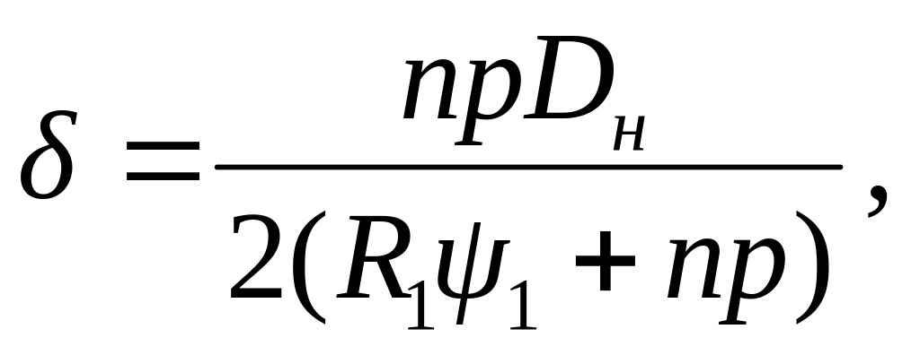 где n - коэффициент надежности по нагрузке - внутреннему рабочему давлению в трубопроводе, принимаемый: для газопроводов — 1.1, для нефтепроводов — 1.15; p – рабочее давление, МПа; Dн - наружный диаметр трубы, мм; R1 – расчетное сопротивление растяжению металла труб, МПа; ψ1 - коэффициент, учитывающий двухосное напряженное состояние труб