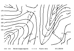 Эта отметка определяется аналогично (∙) В, только измерение расстояния производится по руслу лога.