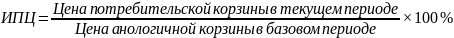 Индекс потребительских цен (ИПЦ) – это соотношение между совокупной ценой определенного набора товаров и услуг (потребительской корзины) для данного временного периода и совокупной ценой сходной группы товаров и услуг в базовом периоде (формула 3) [16, c.16].