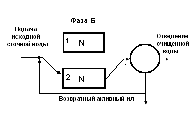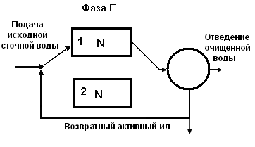 Фаза «А» - в первой емкости происходит денитрификация сточной воды без аэрации, только за счет перемешивания иловой смеси. В тоже время во второй емкости производится нитрификация с проведением аэрации, после чего сточная вода поступает во вторичный отстойник. Заканчивается фаза «А» удалением нитрата содержащегося в сточной воде первой емкости. Фаза «Б» представляет относительно короткий промежуток времени, в течение которого производится аэрация одновременно в двух емкостях, что позволяет произвести отдувку полученного газообразного азота. В фазе «В» вторая емкость используется как денитрификатор и производится удаление нитрата, полученного за время нитрификации в данной емкости. В фазе «Г» также производится одновременная аэрация в двух емкостях, после чего цикл повторяется.