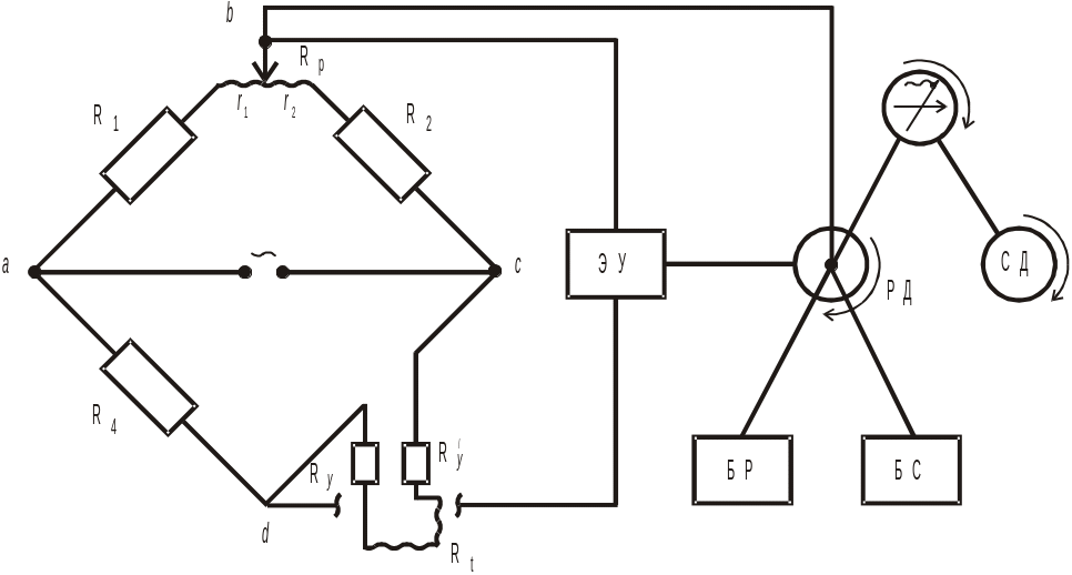 При изменении температуры среды, в которой находится термометр сопротивления, изменится температура термометра и, следовательно, его электрическое сопротивление. Измерительный мост, состоящий из постоянных и переменных сопротивлений (R1, R2 и R4) и питающийся напряжением (6,3 В) от одной из обмоток силового трансформатора, разбалансируется, и в диагонали моста между точками b и d появится напряжение небаланса Ubd. Последнее подается на вход электронного усилителя (ЭУ), где усиливается по напряжению и мощности, затем поступает на реверсивный двигатель РД и приводит в движение его ротор. Вращаясь в ту или иную сторону, в зависимости от знака разбаланса, ротор реверсивного двигателя перемещает механически с ним связанные движок реохорда Rp, стрелку и перо по шкале прибора до тех пор, пока измерительный мост не придет в состояние равновесия. Напряжение на входе электронного усилителя (ЭУ) в этом случае станет равным нулю, электродвигатель РД остановится, а прибор покажет измеряемую температуру.