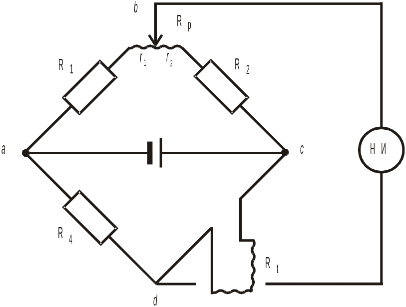 Медный или платиновый термометр сопротивления Rt, электрическое сопротивление которого должно быть измерено, включается в одно из плеч моста при помощи соединительных проводов, имеющих сопротивления R. Другие плечи моста состоят из постоянных манганиновых сопротивлений Rмг и переменного калиброванного сопротивления реохорда Rр, выполненного также из манангина. К одной диагонали моста подведено питание постоянного или переменного тока, в другую включен нуль-индикатор. При равновесии моста удовлетворяется равенство: