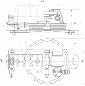 У пристосуванні (рисунок 34) заготовка встановлюється в призму 1, реалізовуючи подвійну направляючу базу (опорні точки 1,2,3,4 на рисунку 33). Опорна база (опорна точка 5 на рисунку 33) реалізується після закріплення заготовки коротким циліндричним пальцем (опорна прихована база, опорна точка 6 на рисунку 33 ).