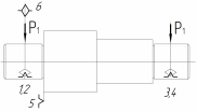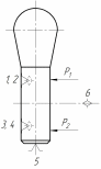 Пристосування застосовується при фрезеруванні шпонкових пазів, лисок уступів в деталі типу вал (рисунок 47) і призначене для базування заготовки двома центровими отворами: ліва конічна поверхня (установча центруюча база - опорні точки 1,2,3) і права конічна поверхня (центруюча поверхня - опорні точки 4,5); площиною (опорна база, опорна точка 6), якою заготовка базується на направляючу втулку переднього центру і закріплення заготовки силою Р.