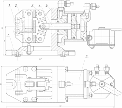 Пристосування (рисунок 64) складається із пневмоприводу 1, корпусу, 2 на якому розташовані настанови 3 та 7 зі змінними призмами, упор 4, тяга 6, яка з’єднана зі штоком пневмоприводу, важіль 7.