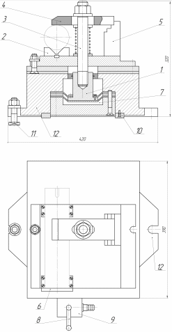 Дане пристосування займає горизонтальне положення і кріпиться на столі верстата за допомогою настановних шпонок 10 та болтів 11.