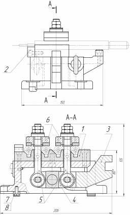 В пристосуванні (рисунок 56) заготовка встановлюється на дві призми 4 зовнішньою циліндричною поверхнею (подвійна направляюча база; опорні точки 1, 2, 3, 4), площиною (торцем) упирається на стійку 5 (опорна база; опорна точка 5). Опорна прихована база (опорна точка 6) реалізується після закріплення заготівки. Після увімкнення пневмоприводу 2, поршень 7 рухається в своє крайнє верхнє положення, передаючи рух на задню частину важеля 3, що і забезпечує закріплення заготовки. Важіль жорстко закріплений на опорі 6. Після проведення циклу обробки, деталь знімають в зворотному порядку, важіль повертається в початкове положення за рахунок пружини 8, та поршня 7 пристосування. Встановлюється інша заготовка і цикл обробки повторюється.