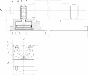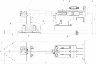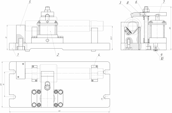 У пристосуванні (рисунок 36) заготовка опорною базою спирається на упор 1 (опорна точка 5 на рисунку 35), подвійною направляючою базою встановлюється в отвір типової змінної касети 7 (опорні точки 1, 2, 3, 4). Закріплення заготовок здійснюється за допомогою пневмоциліндру 9 , змонтованого на плиті 2, важеля 3 і качалки 4, який затискує змінну касету 7 зі встановленими в ній заготовками. Після закріплення заготовки фіксуються по опорній прихованій базі (опорна точка 6). Положення упору 1 по висоті може регулюватися за допомогою гвинта 5 і фіксуватися в необхідному положенні гвинтом 6.