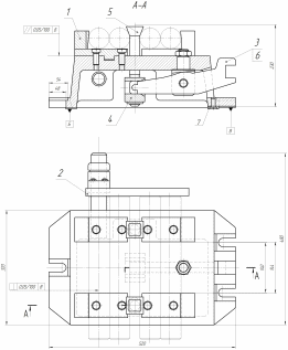 У пристосуванні (рисунок 30) заготовка подвійною направляючою базою встановлюється на поверхні призми 1 (опорні точки 1,2, 3, 4), яка закріплена на корпусі 6; опорною базою притискається до поверхні торця призми 1 (опорна точка 5). Опорна прихована база (опорна точка 6 на рисунку 29) реалізується після закріплення заготовки. Зусилля затиску передається від важеля пневмокамери на затискувачі 2 і 3 за допомогою важеля 4 і коромисла 5. Встановлення пристосування на верстаті забезпечується настановними шпонками 7 і кріпильними елементами, які заходять в спеціальні пази на столі верстата.