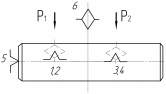Двомісне пристосування застосовується при фрезеруванні торців і призначене для базування заготовок (рисунок 41) зовнішньою циліндричною поверхнею (подвійна направляюча база; опорні точки 1, 2, 3, 4 на рисунку 41), площиною (опорна база; опорна точка 5) і закріплення заготовки силами Р1 і Р2.